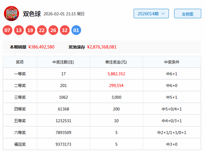 双色球第2026014期奖号为:07、13、19、22、26、32+01。