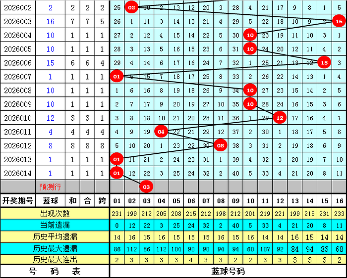 蓝球分析:上期蓝球开出号码01,重复开出前期蓝球,最近10期蓝球号码大小比为5:5,本期预计小 号蓝球再出,关注蓝球03。